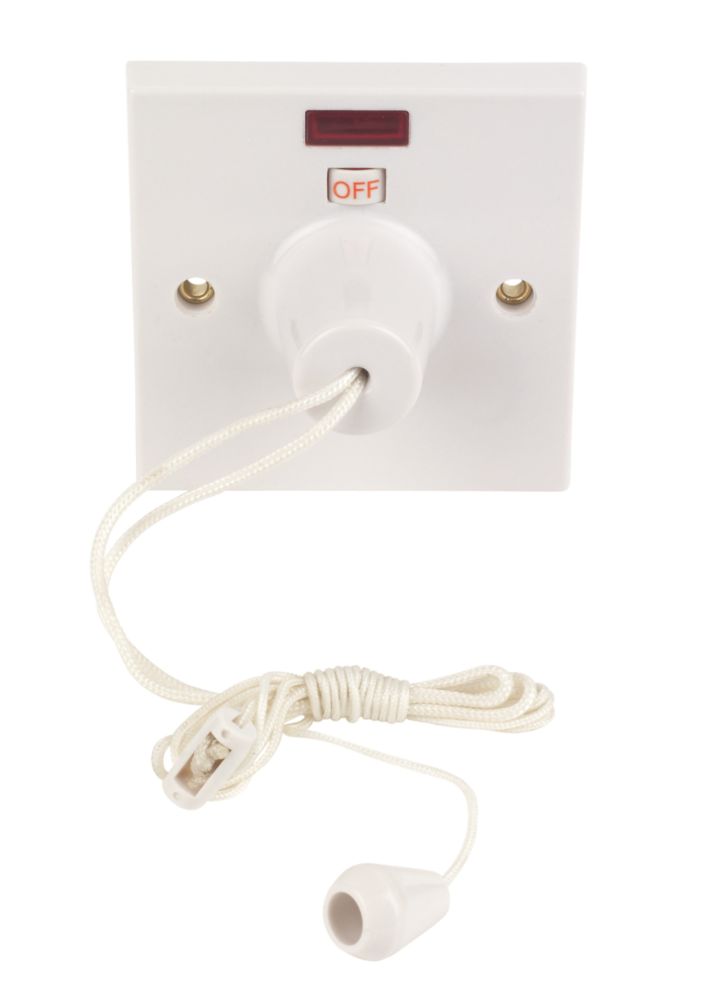 A 1 way double pole flush ceiling switch with pull cord operation neon and mechanical on off indicators and a 50a current rating.